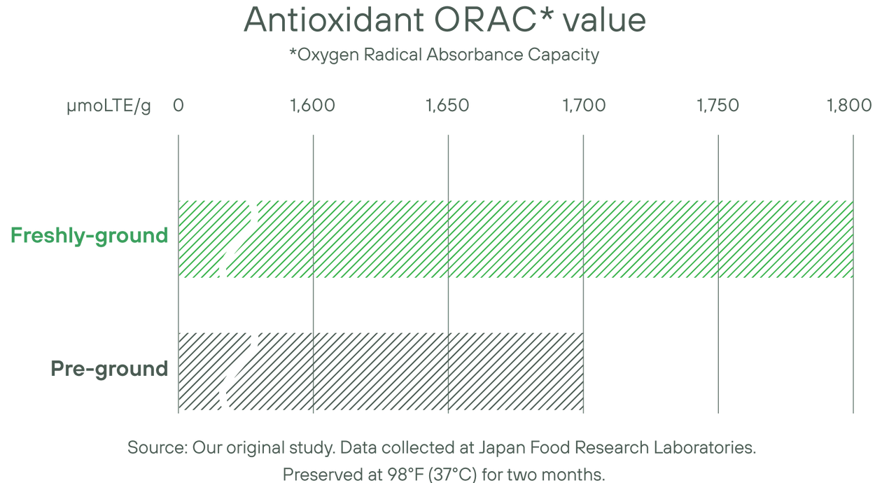 Matcha leaves hold their freshness, flavor and nutrients longer than pre-ground matcha powder. Even after two months, matcha leaves maintain a higher level of antioxidants than matcha powder.
